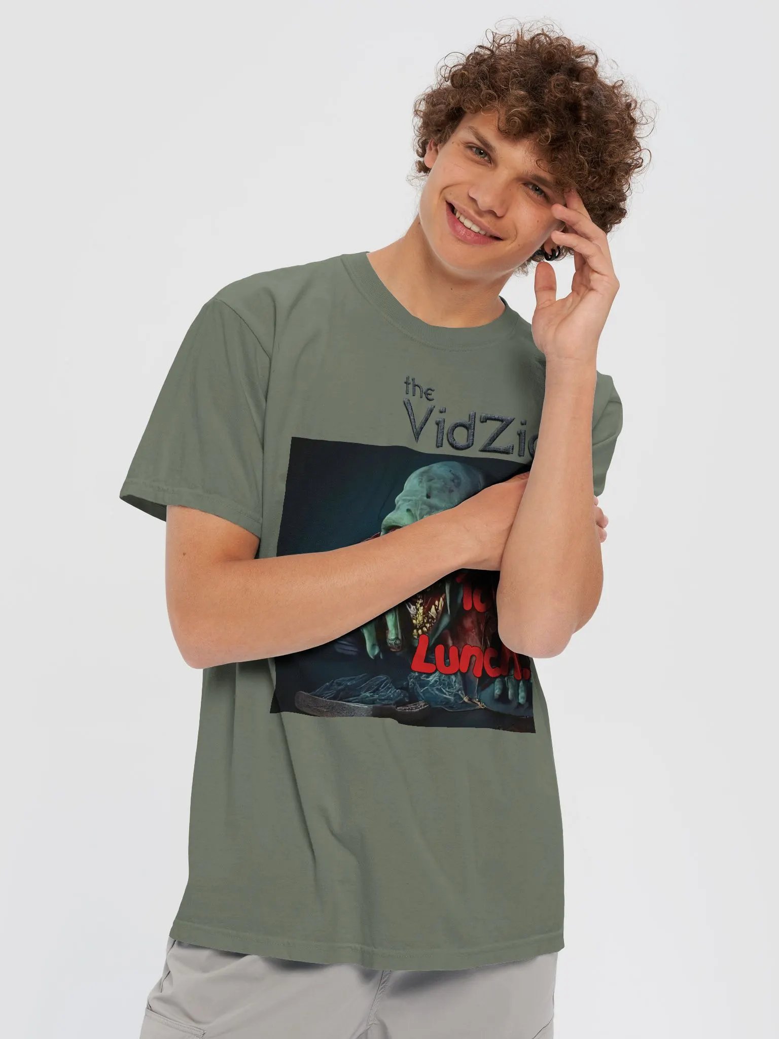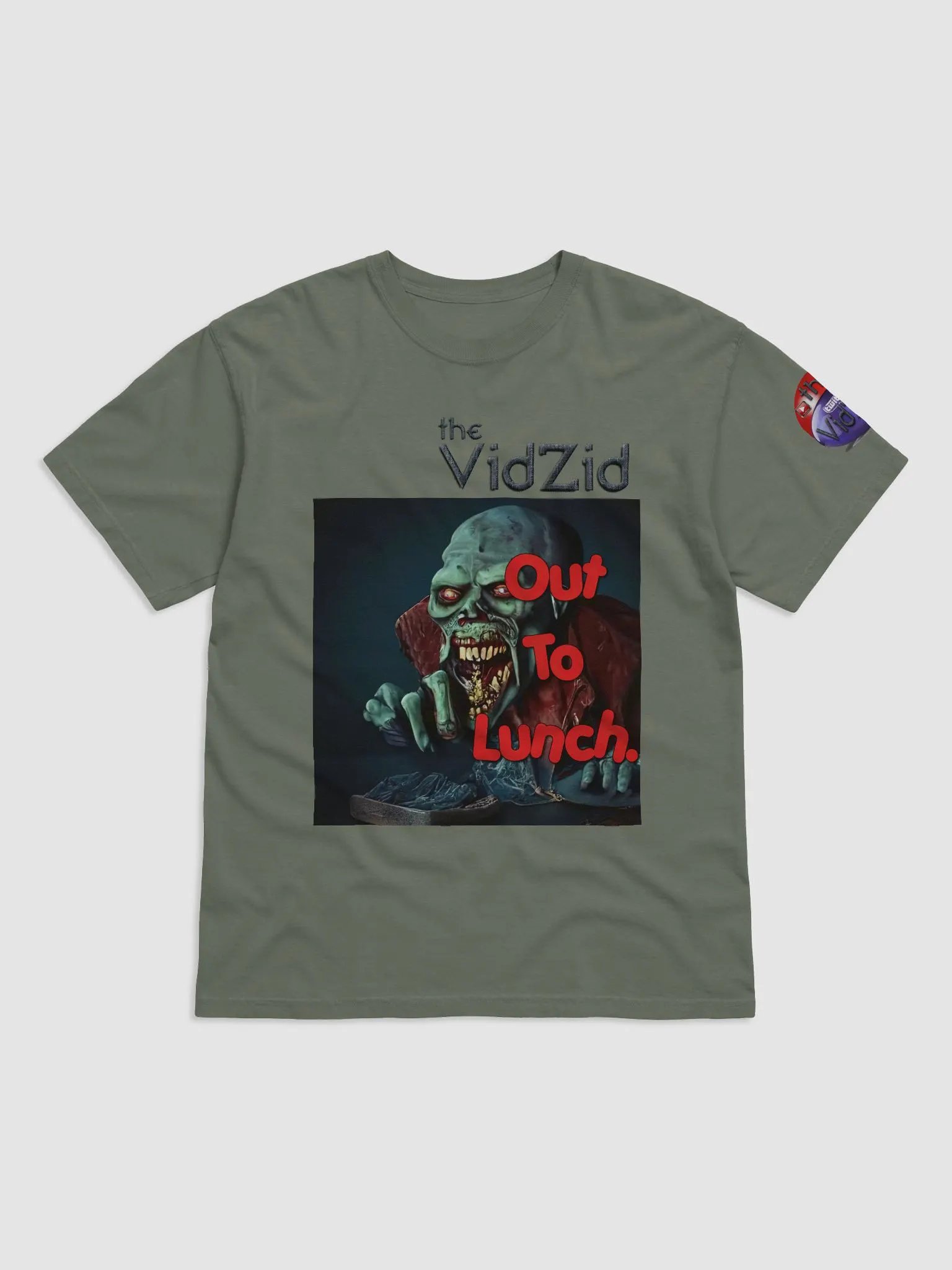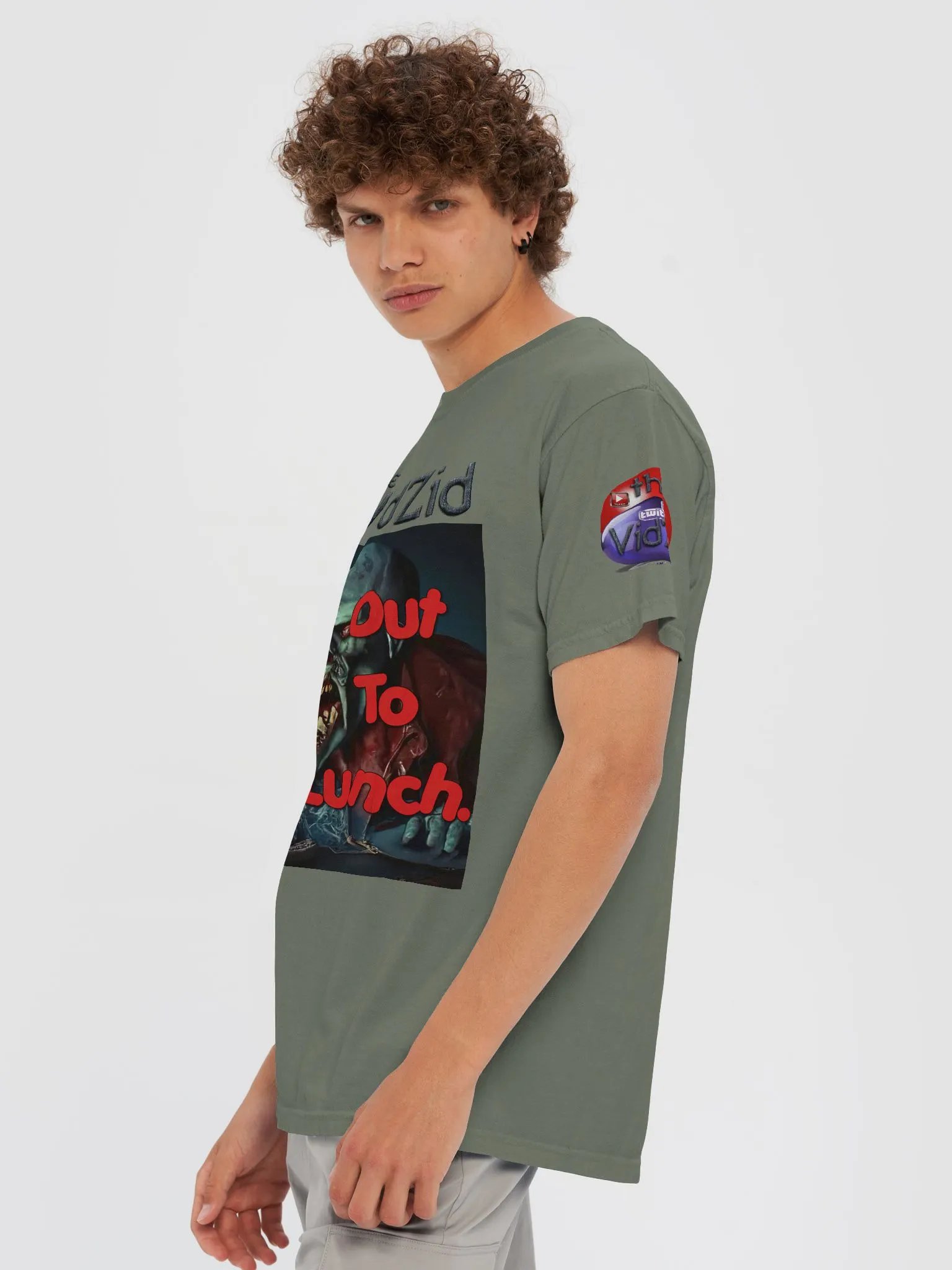 - Front: The centerpiece of the shirt is a meticulously detailed graphic of a zombie mid-bite, with exaggerated, cartoon-like features to keep the mood fun rather than frightening. The zombie is depicted with its mouth wide open, chomping down on a comically large sandwich, emphasizing the phrase "Out to Lunch."
