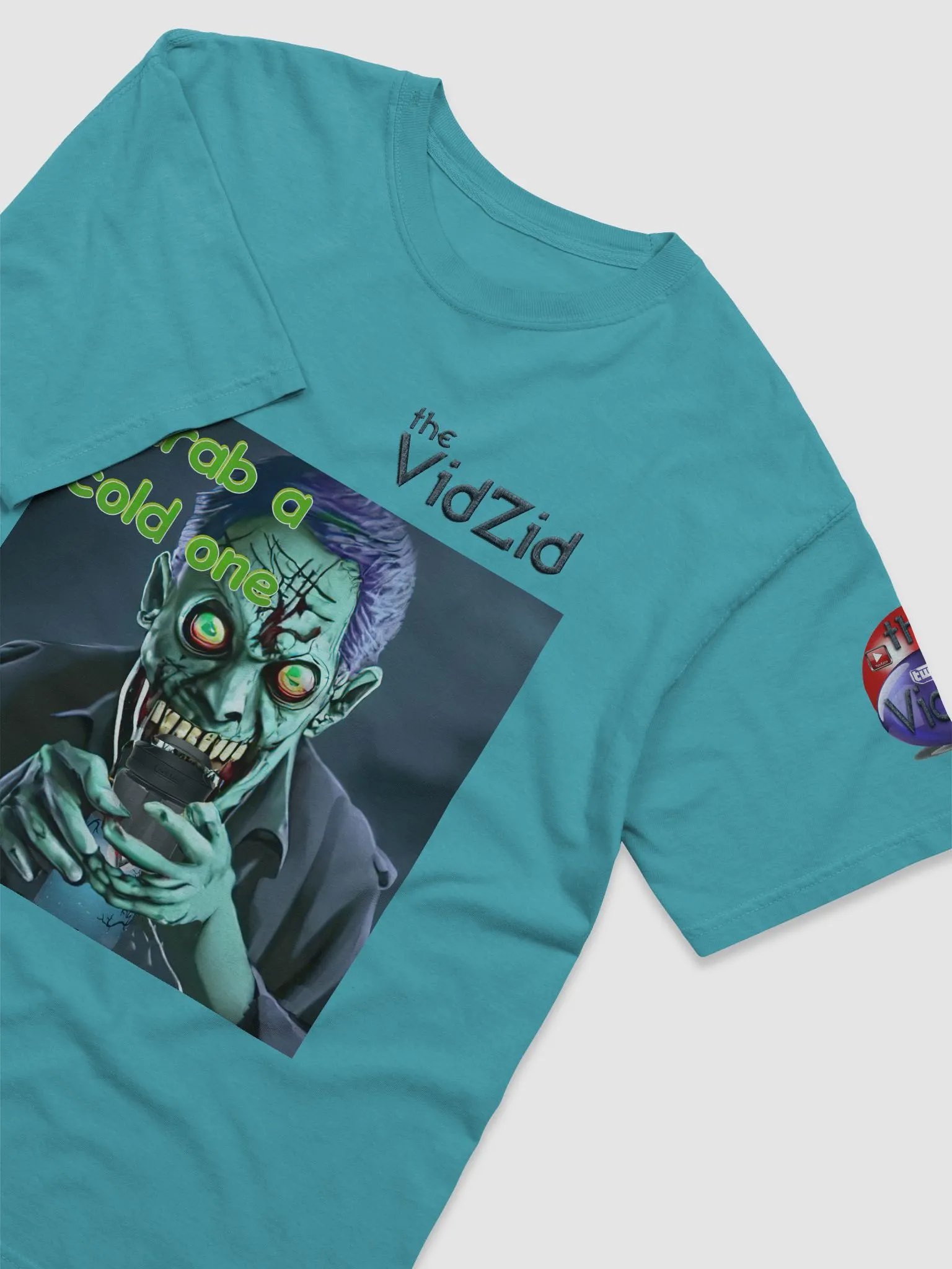 • Slogan: The phrase "Grab a Cold One" is prominently displayed in a vibrant, playful font above the zombie, adding a humorous twist to the macabre image.