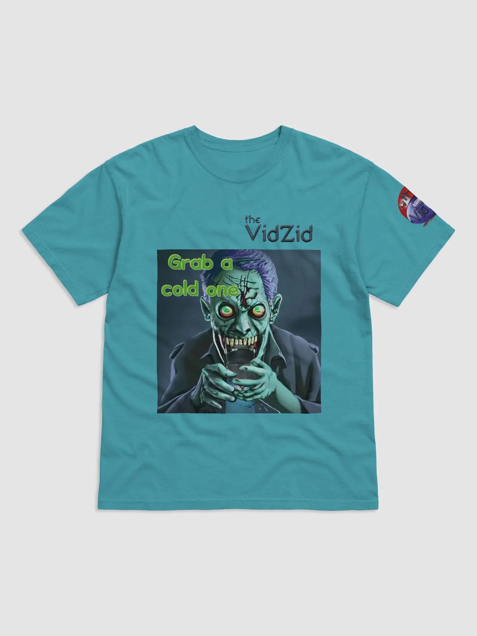 • Front Graphic: The front of the t-shirt showcases a vividly detailed zombie, illustrated with eerie precision. The zombie has a ghastly, greenish hue, with a sinister grin and piercing eyes, clutching a beverage can. The design is both spooky and fun, making a bold statement.